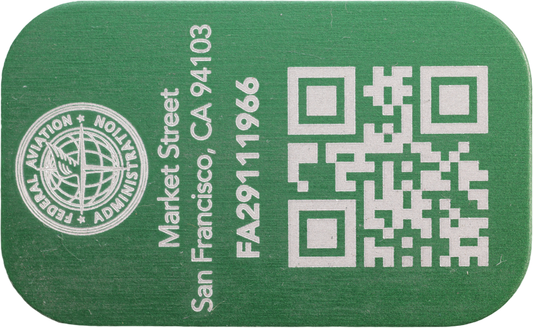 FAA Registration Plate for Drones, QR-Code with 2 address lines, 31x19mm anodized aluminium plate in different colours with FAA Logo
